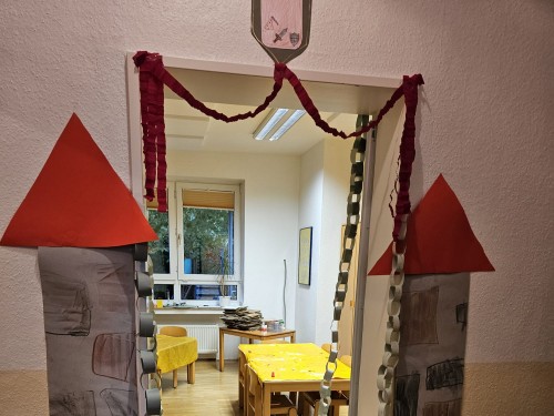 Danach begannen die Ritterspiele: Hufeisenwerfen, Ritter-Ausrüstung herstellen, Burgbau um die Wette, Hindernis-Parkour mit Steckenpferden, Burggraben und Balancier-Strecke, Wett-Wickeln, Schatz-Suche und vielem mehr.