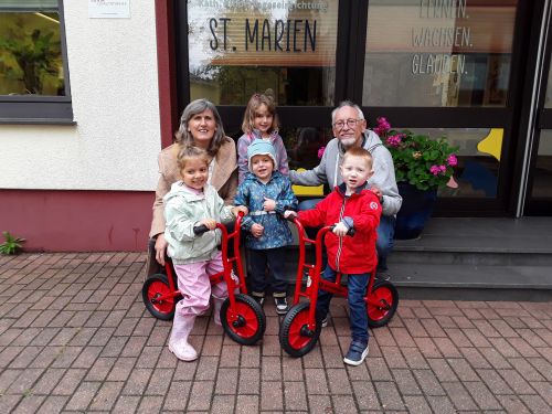 Da war die Freude der Kinder groß. Gleich zwei neue Laufräder wurden von Ulli Völker als Vertreter des Fördervereins von St. Marien an die Kinder der Kita überreicht.